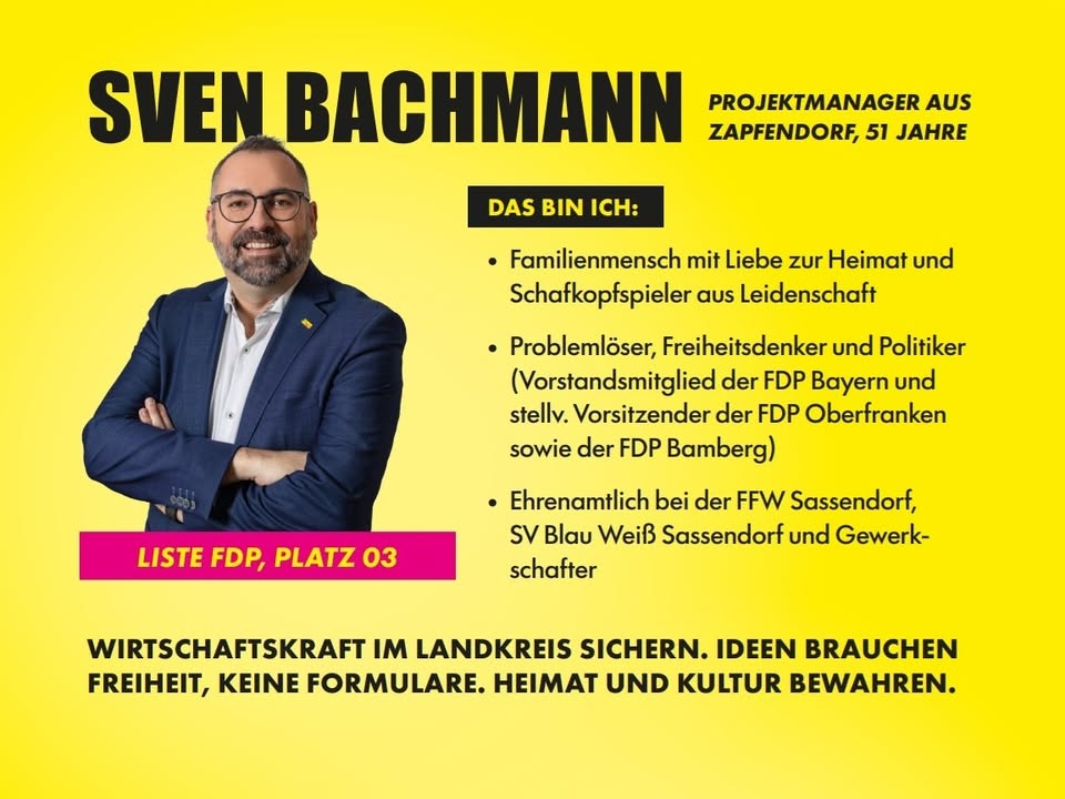 Heute stellen wir Platz 3 unserer Kreistagsliste im Landkreis Bamberg vor: unseren stv. Kreisvorsitzenden Sven Bachmann. Er ist auch stellv. FDP-Bezirksvorsitzender und vertritt Oberfranken im Landesvorstand der FDP Bayern. Nicht vergessen: Unterstützt Sven Bachmann bei der Kommunalwahl am 8.3. mit drei Stimmen und setzt das Listenkreuz bei der FDP!