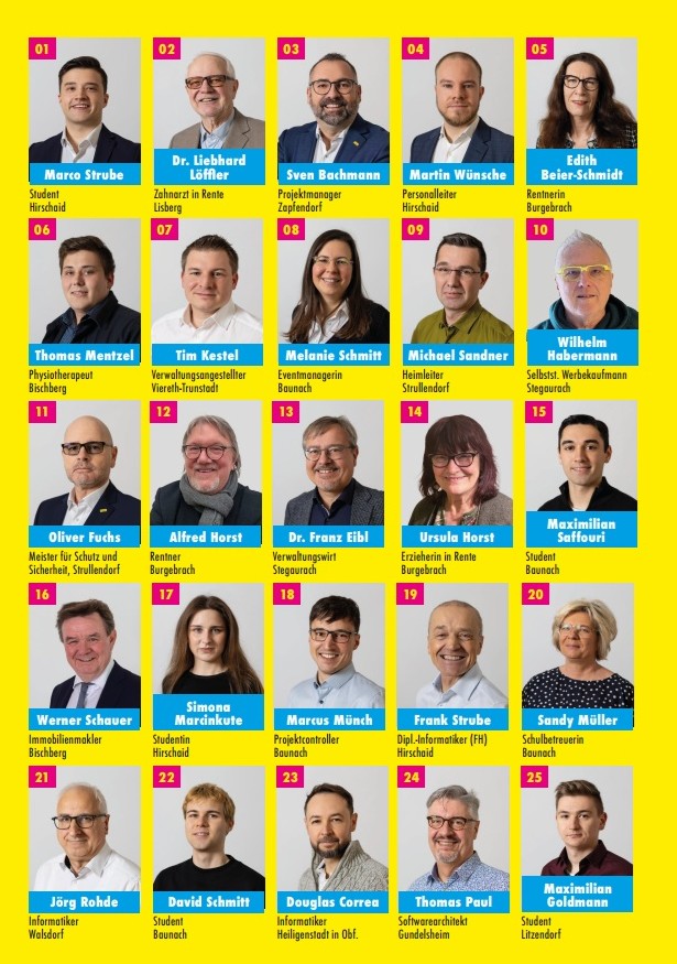 Hier sind sie: Die ersten 25 Kandidatinnen und Kandidaten unserer Kreistagsliste im Landkreis Bamberg! Ihr wollt diese Kandidatinnen und Kandidaten unterstützen? Das geht ganz einfach! Setzt einfach Euer Listenkreuz bei der FDP - und Ihr könnt darüber hinaus Euren Favoriten auch noch persönlich drei Stimmen geben! Insgesamt habt Ihr 60 Stimmen. Am 8. März am besten mit allen Stimmen bei der Kreistagswahl FDP wählen! Für Freiheit, Fortschritt und eine Politik der Verantwortung!