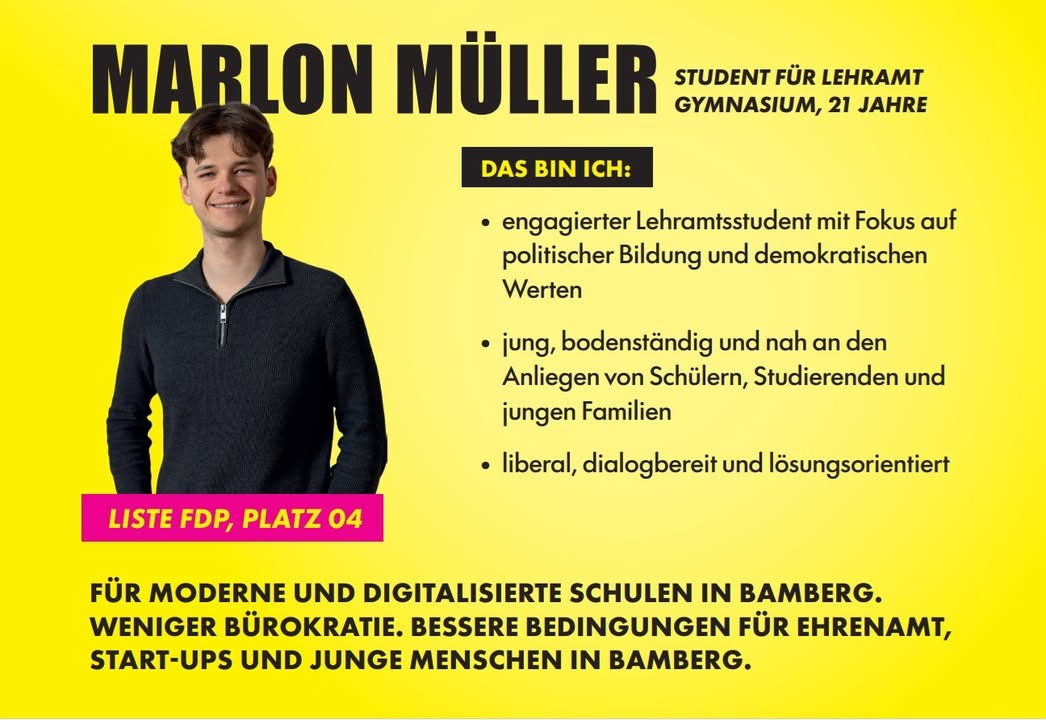 Heute stellen wir Platz 4 unserer FDP-Stadtratsliste für die Kommunalwahl in Bamberg am 8. März vor: Unseren stellv. FDP-Ortsvorsitzenden Marlon Müller. Unterstützt Marlon bei der Wahl mit 3 Stimmen! Und einem Listenkreuz bei der FDP! Für erstklassige Bildung, für eine starke Wirtschaft und für eine Verkehrspolitik mit Vernunft! Für einen echten Politikwechsel in Bamberg nach sechs Jahren Rot-Grün!