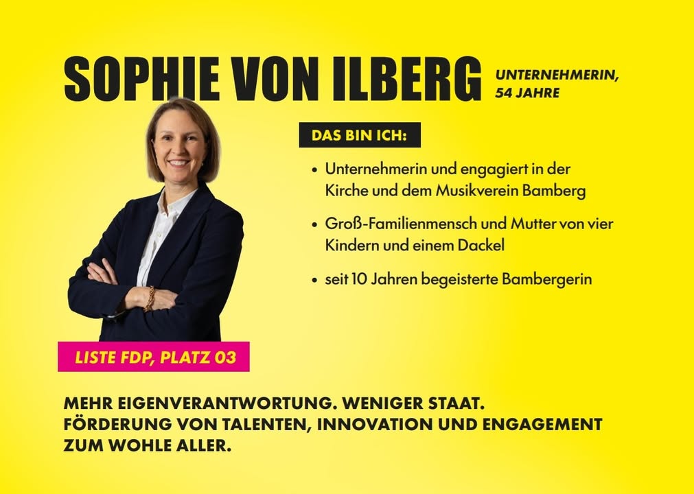 Heute stellen wir Platz 3 unserer FDP-Stadtratsliste für die Kommunalwahl in Bamberg am 8. März vor: Unsere stellv. FDP-Ortsvorsitzende Sophie von Ilberg. Unterstützt Sophie von Ilberg bei der Wahl mit 3 Stimmen! Und einem Listenkreuz bei der FDP! Für eine starke Wirtschaft, für erstklassige Bildung und für eine Verkehrspolitik mit Vernunft! Für einen echten Politikwechsel in Bamberg nach sechs Jahren Rot-Grün!